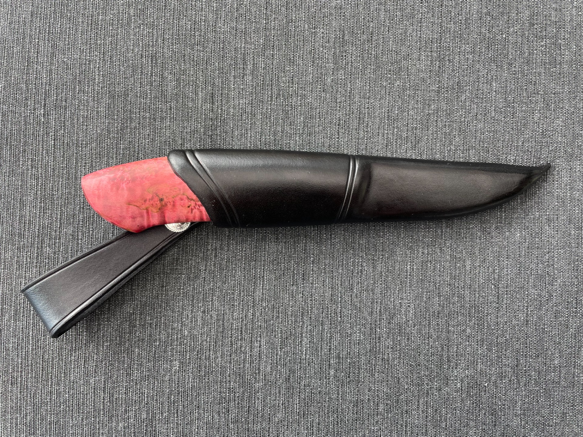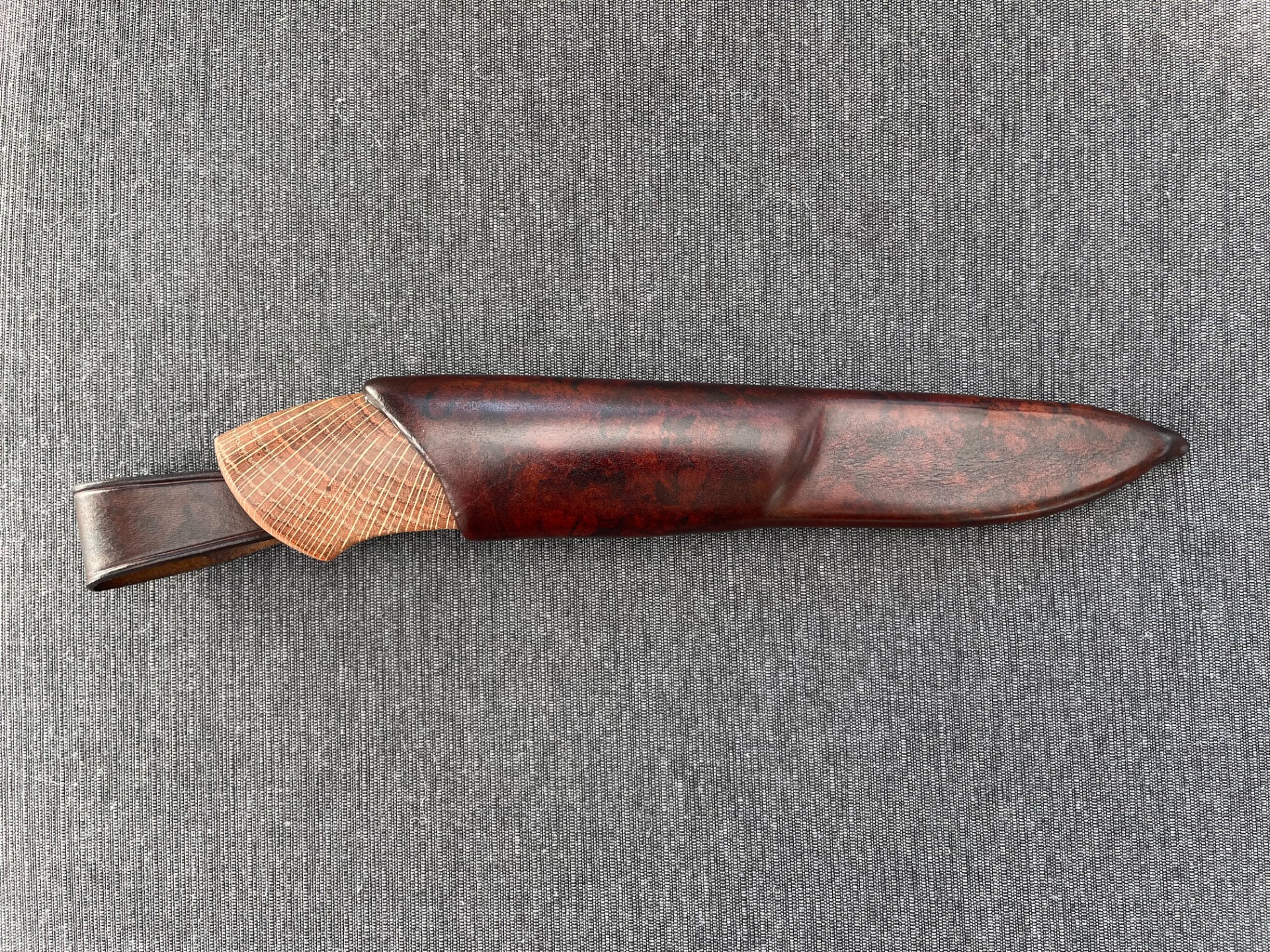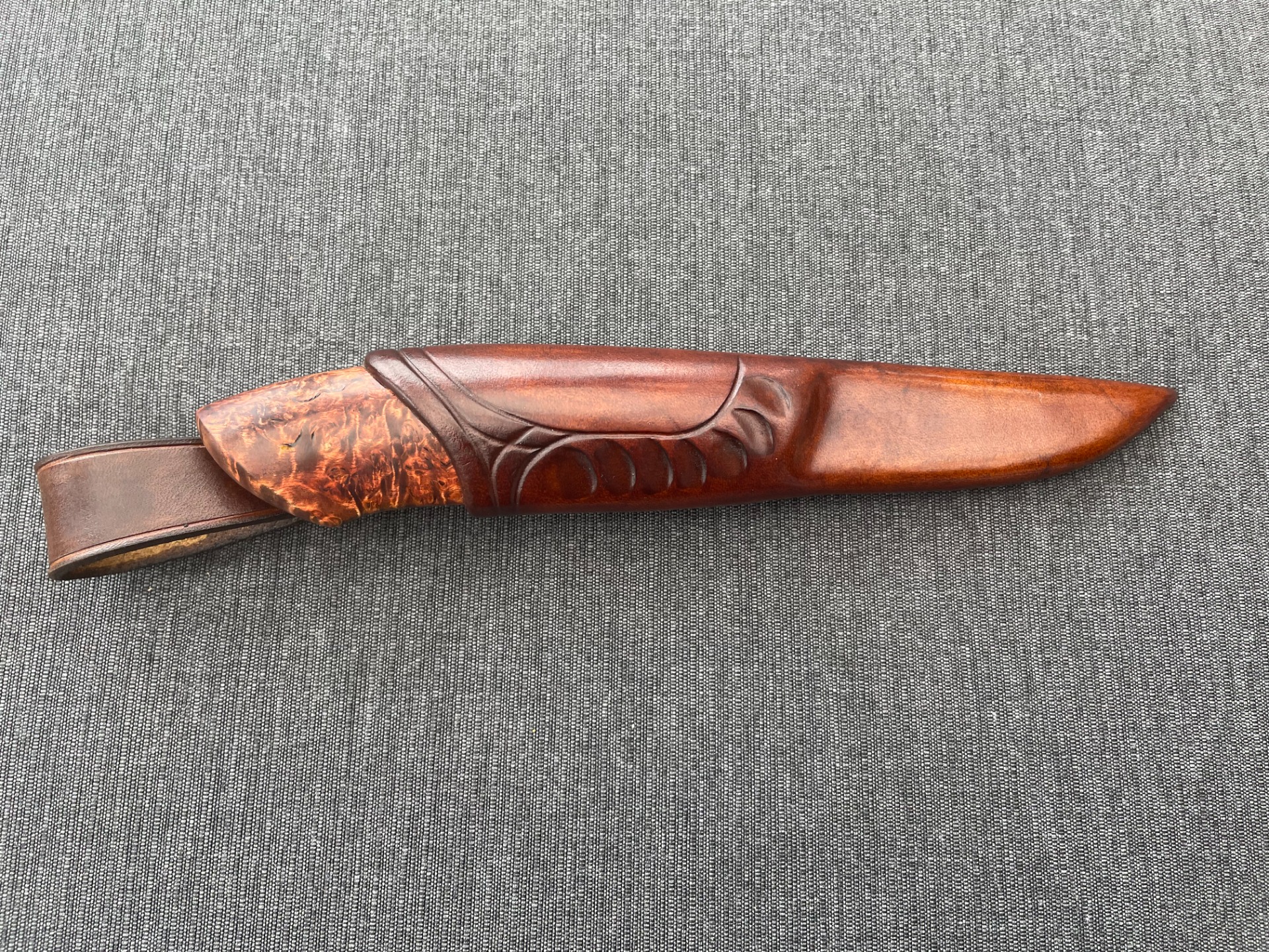 Slire: Masurlær m/pynteknapp i valbjørk, sømmen på toppen av slira.