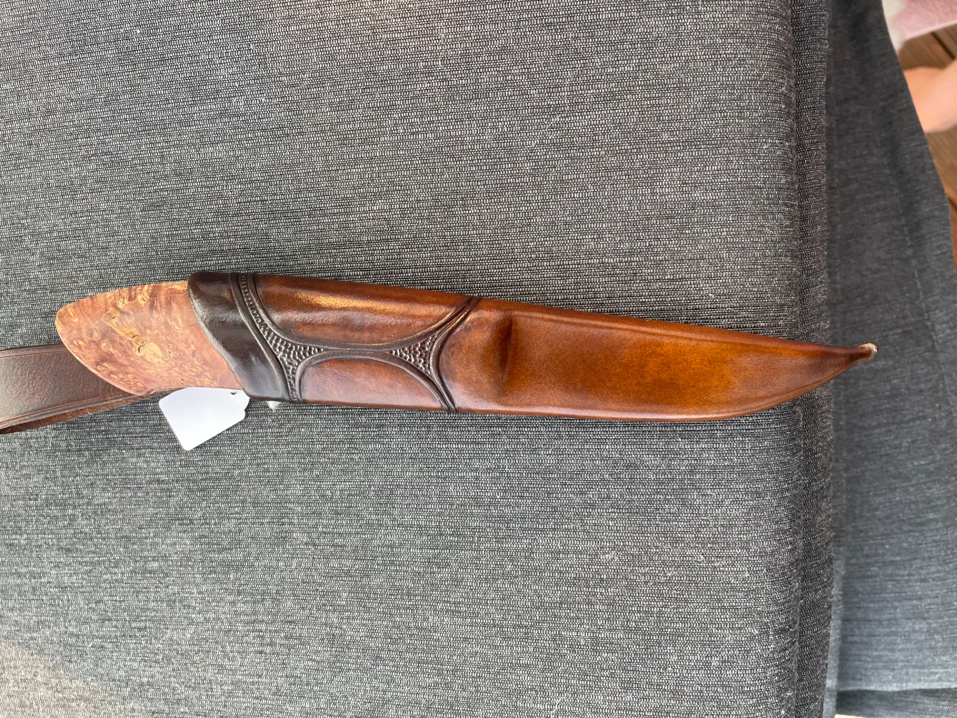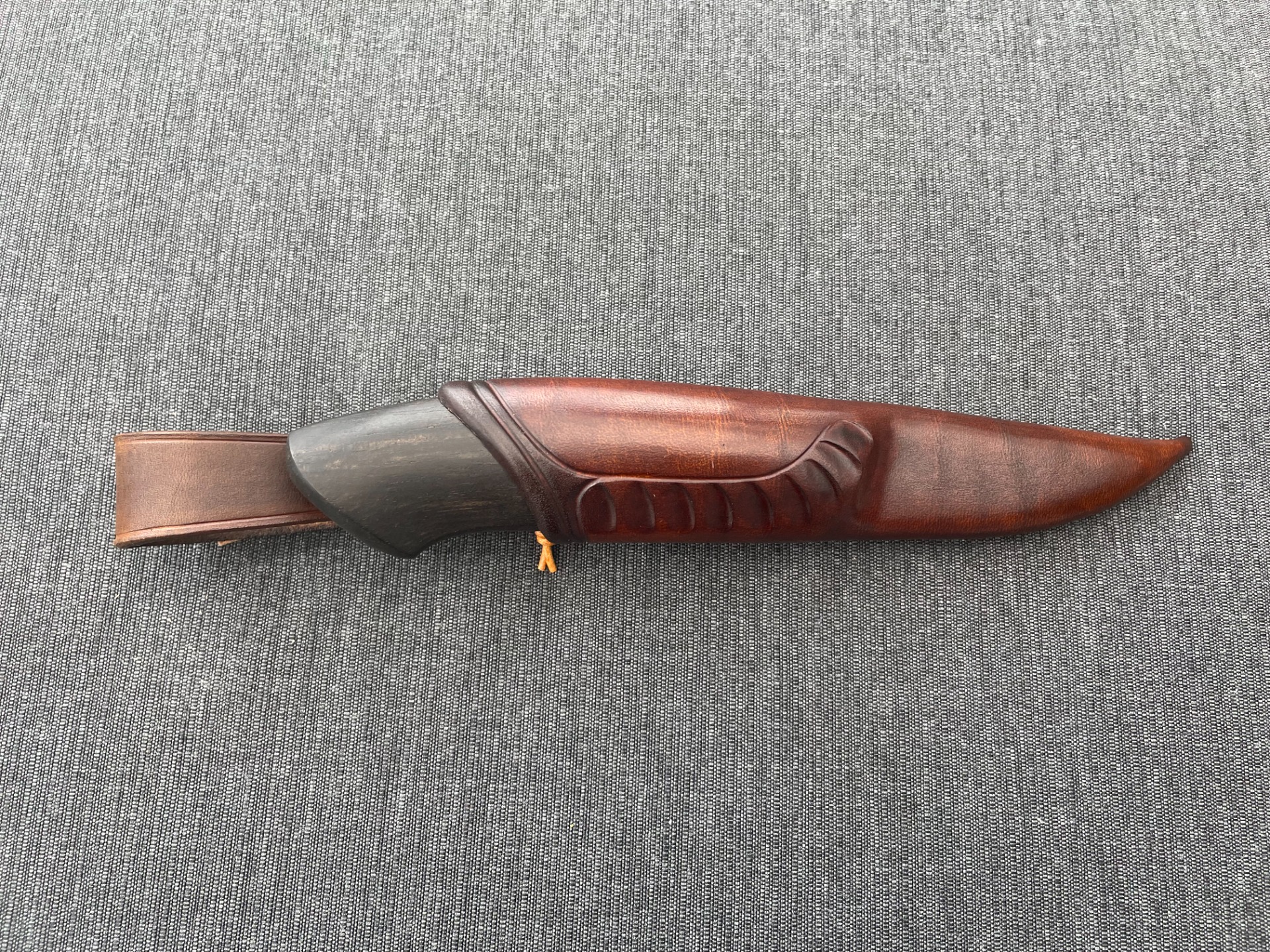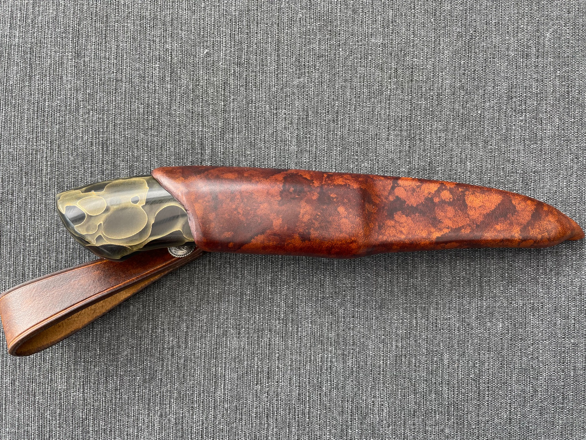Slire: Masurlær m/pynteknapp i valbjørk, sømmen på toppen av slira.