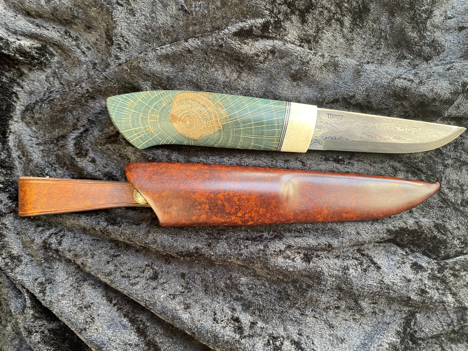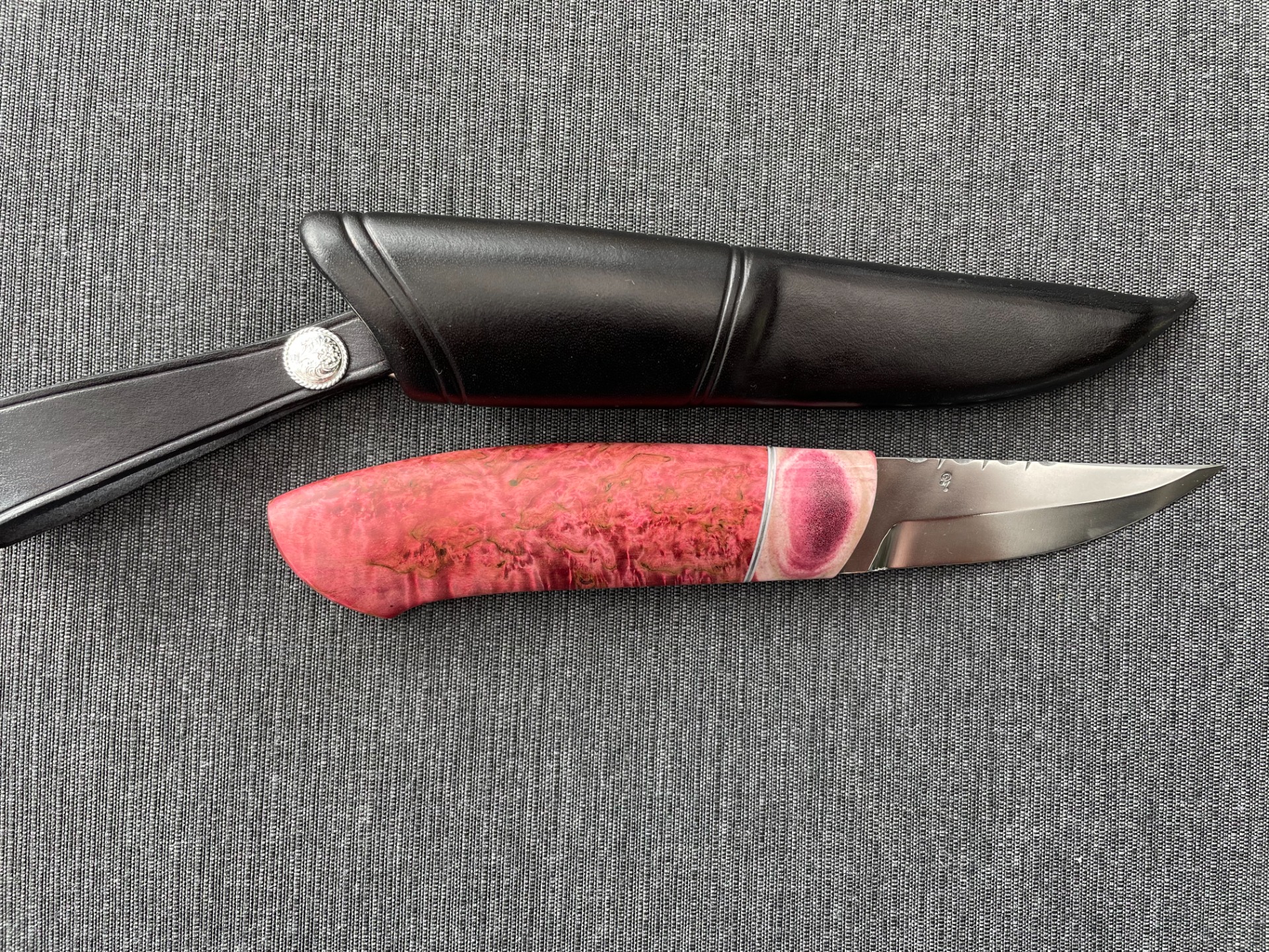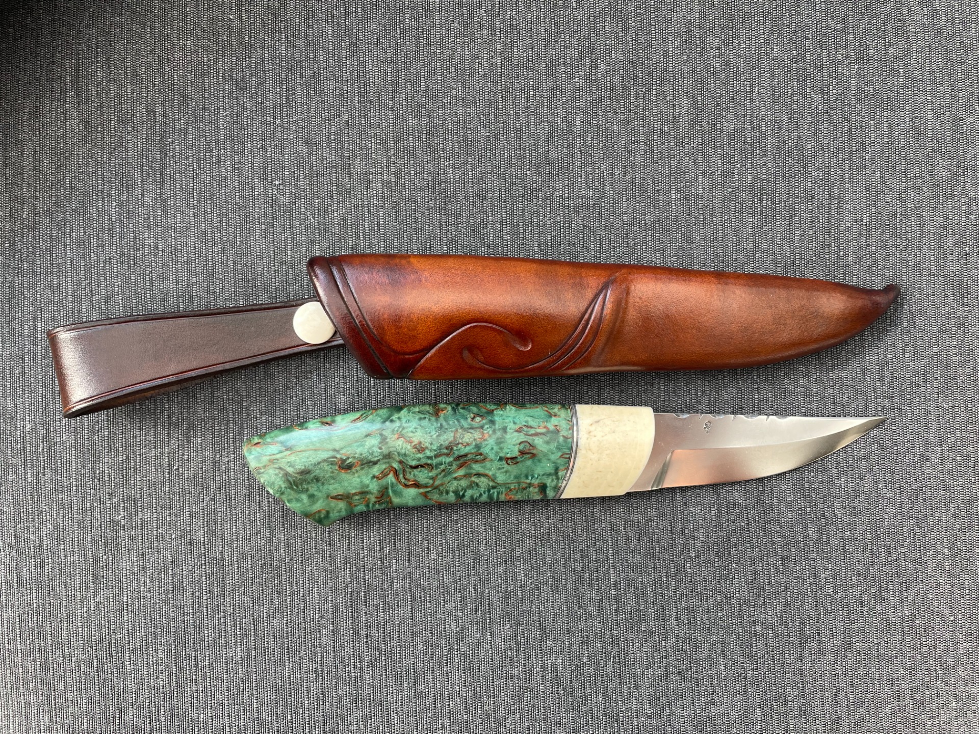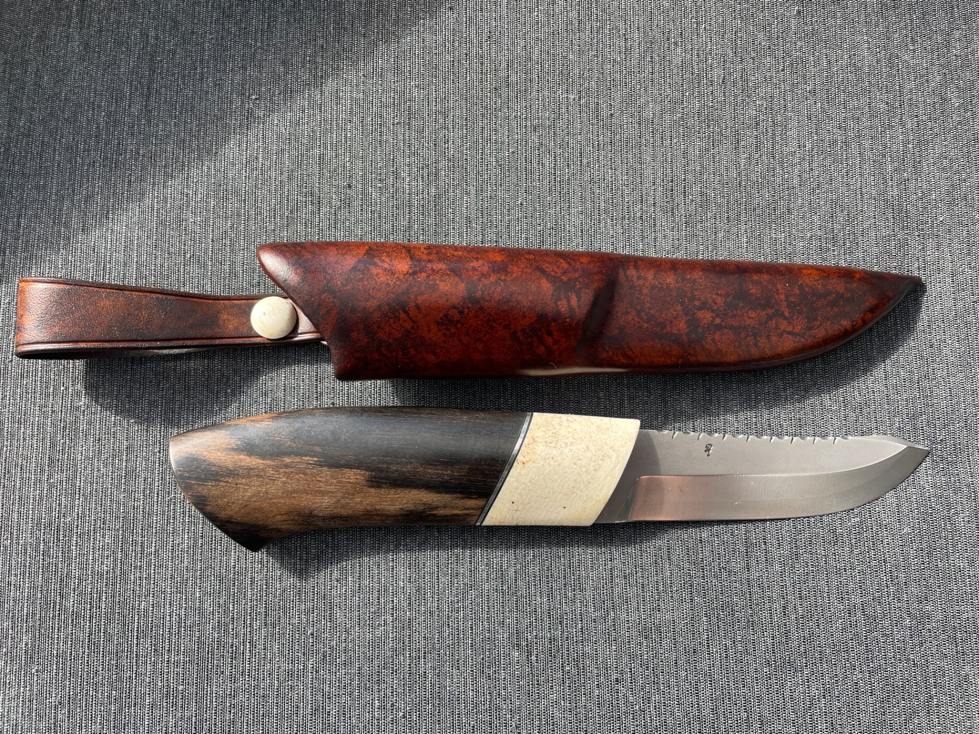 Skaft: Flott kniv med litt spesielt skaft. Endeholk og frontholk i hvalkjeve, mønsterfilt innlegg i sølvtinn, mellomstykke i rødfarget mammut jeksel.