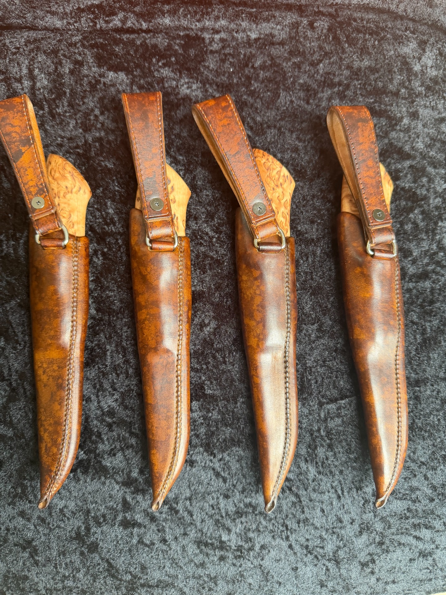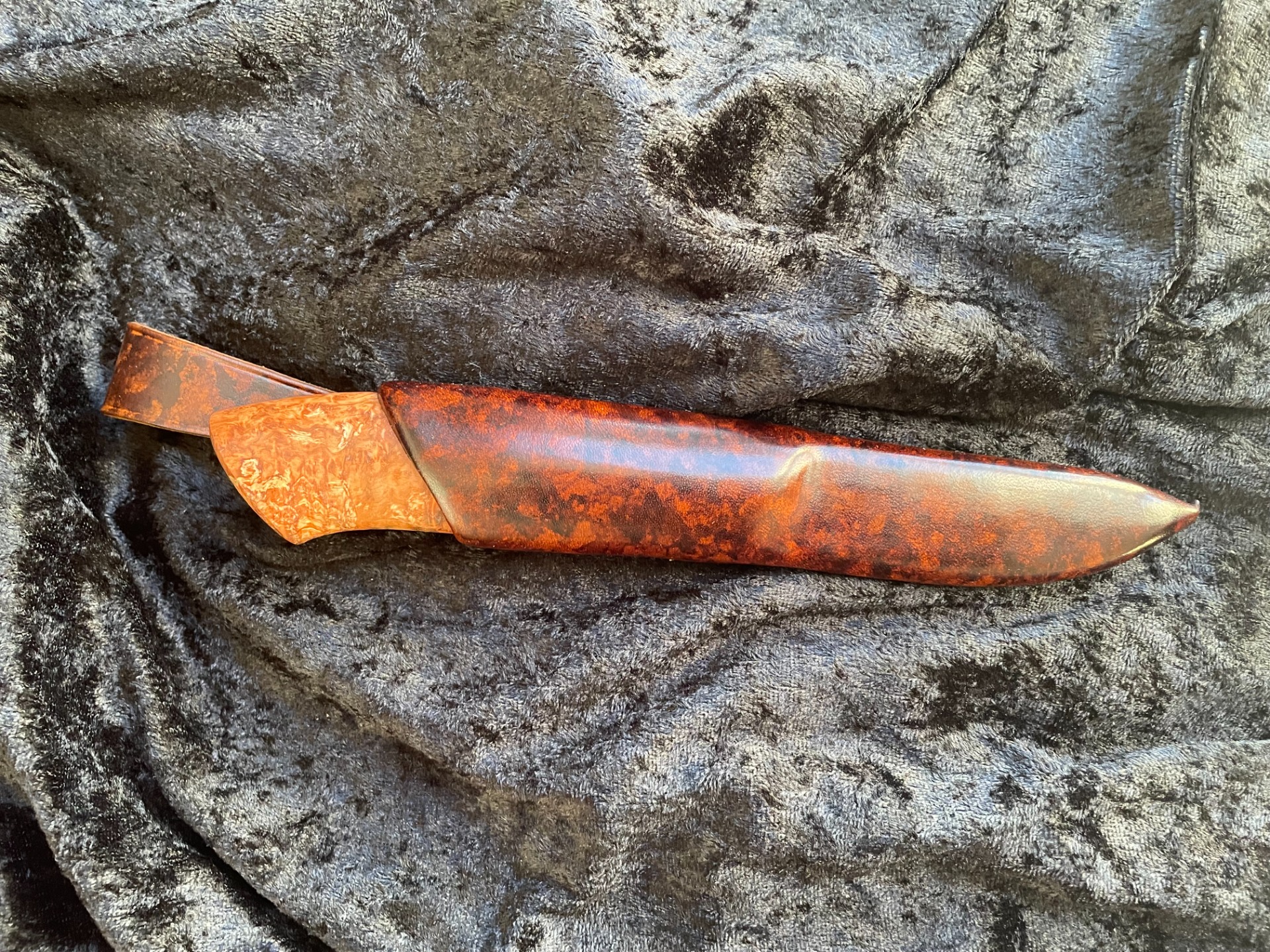 Skaft: Stabilisert tverrkuttet Valbjørk, sølvtinn og vulkanfiber, frontholk i stabilisert Bøk